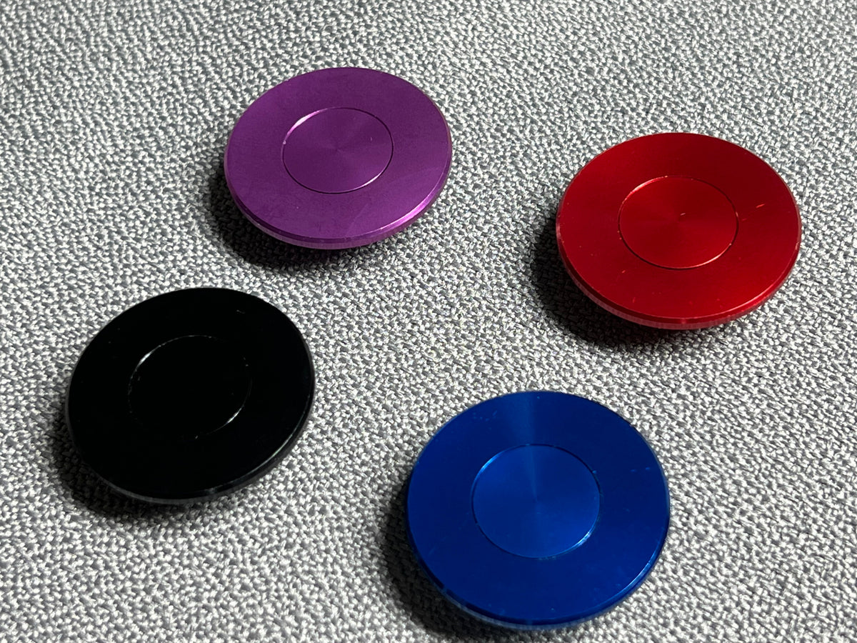These top caps are machined aluminum and have an aluminum bolt cover that is laser engraved, paint filled, or UV printed with your custom logo or text.